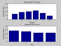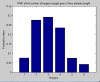 Objective: Learn to plot a joint PMF Starter: Refer to HW4_prob_example.m Functions to Learn: none Problem: Please download all of the files associated with this homework and put them into your working directory when you do this problem. The file simulate_joint_pmf.m is necessary for hw4_prob_example.m to work correctly. Read through HW4_prob_example.m and execute it so you can see how a joint PMF can be described in terms of matrices, simulated, and visualized. You have been employed by McTacoKing to do an analysis of their customer purchasing habits. They have given you data on 10,000 normal customers: X is the number of burgers each ordered, and Y is the number of servings of fries. All normal customers order at least one burger and at least one serving of fries. For all normal customers, the maximum number of burgers is six and the maximum number of fries is four. This data is given to you as a burgerfry.mat le that you must load which contains the variable outcomes which has the customer data. a) First, plot the estimated joint PMF of the burger/fry data as a 3-dimensional X, Y graph as shown in the example code. Turn in your plot and the corresponding matrix. This will serve as the actual PMF for the rest of the problem. b) What is the probability that a normal customer will buy three burgers and two servings of fries? c) What is the marginal PMF for the number of burgers a normal customer will buy? Plot this and turn it in. d) What is the marginal PMF for the number of fries servings a normal customer will buy? Plot this and turn it in. e) What is the expected number of burgers that a normal customer will buy? f) What is the expected number of fries servings that a normal customer will buy? g) If burgers cost $2.00 and fries servings cost $1.00, what is the expected amount of money that you will obtain from each normal customer? h) If a normal customer buys two fries servings, what is the PMF of the number of burgers that he will buy? Plot this and turn it in.